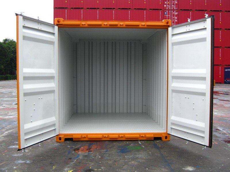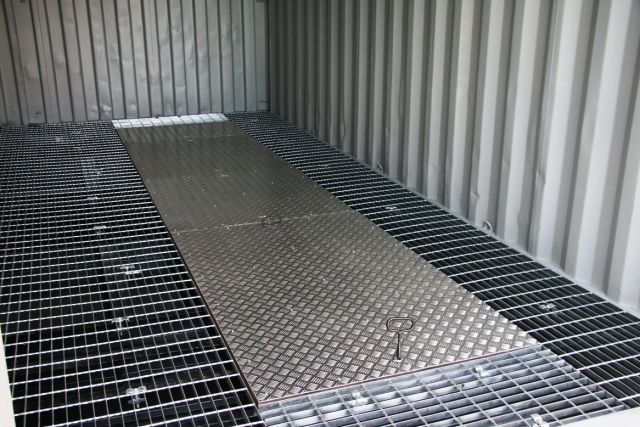 This is achieved either by having a raised bund at the front of the container or by having a sub-floor sump with guttering and